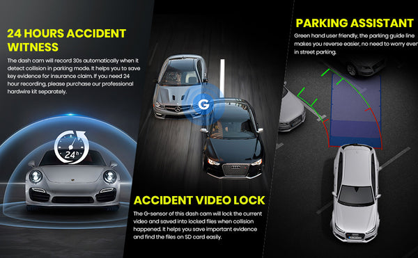 GPS Tracking and Parking Monitoring with Battery Protection: The included GPS module allows you to add driving speed, location and route to the recorded files for later use. With the hardwire kit connected, the dual car recorder automatically shoots video after a collision is detected, then turns off after 30 seconds of locked video to prevent the car's battery from running out.