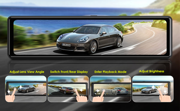 Removable front camera and longer rear camera cable:11-inch full touch screen rearview mirror car recorder breaks the way the camera and screen of the car recorder are connected as one, with the latest removable camera, the camera is separated from the screen, the removable front camera can be placed anywhere on the windshield to avoid obstruction from other devices. Making the screen slimmer and sleeker. In addition, the 11-inch full touch screen allows you to swipe the screen left and right to easily switch between front and rear view mirror views.