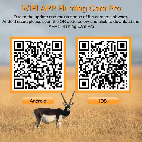 La caméra de suivi est intégrée au WIFI, vous pouvez modifier les paramètres et vérifier directement les images ou les fichiers vidéo sur le téléphone. Veuillez télécharger l'APP (nom de l'APP : Hunting Cam Pro) sur votre téléphone mobile, puis connectez-vous au WIFI pour fonctionner.