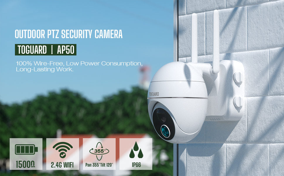 La caméra de sécurité domestique TOGUARD est la première caméra de sécurité extérieure sans fil PTZ avec batterie rechargeable de 15 000 mAh, faible consommation d'énergie, la caméra de sécurité sans fil AP50 peut fonctionner en continu pendant plus de 40 jours avec une charge complète. La connexion WiFi 2.4G est plus pratique, vous permettant de vous débarrasser du câble et du câble réseau, en vous démontant facilement. Il vous permet également de contrôler l'objectif de la caméra depuis votre téléphone portable pour qu'il pivote de 120 degrés vers le haut et vers le bas et de 355 degrés vers la gauche et la droite, pour surveiller fondamentalement chaque coin de votre maison, sans impasse. Un comportement suspect ne peut pas être caché. (La plupart des autres caméras PT ne pivotent que de 90 degrés vers le haut et vers le bas)