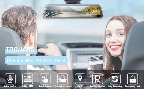 The mirror dash cam with 2.5k+1080p front and rear camera records clear video in day and night. 12 inch big screen makes it clearly read the license plate of vehicle behind or in front of you. The waterproof rear camera is available to work in raining day, assuring accident or insurance claim.