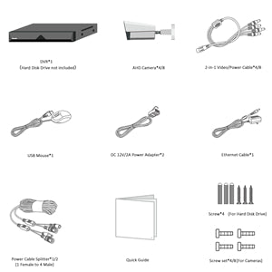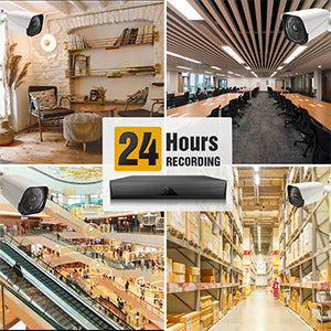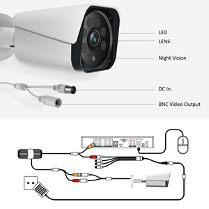 Use the included cable to connect the camera, monitor screen and router to the DVR, camera and DVR power to monitor indoors and outdoors, such as houses, offices, stores, yards, warehouses, restaurants, etc. 24/7. This video recording system supports video preview, recording, simultaneous playback and backup